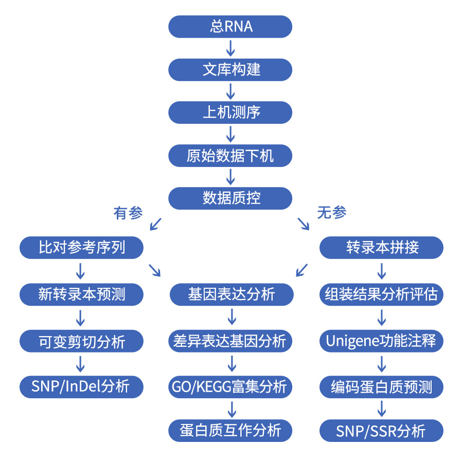 真核有參轉錄組測序(RNA-seq)采用Illumina測序平臺,對真核生物特定組織或細胞在某個特定狀態(tài)下轉錄的所有mRNA進行測序,與參考基因組比對,既可全面快速分析mRNA序列和豐度信息、又可對基因結構和產(chǎn)生的新轉錄本進行分析。