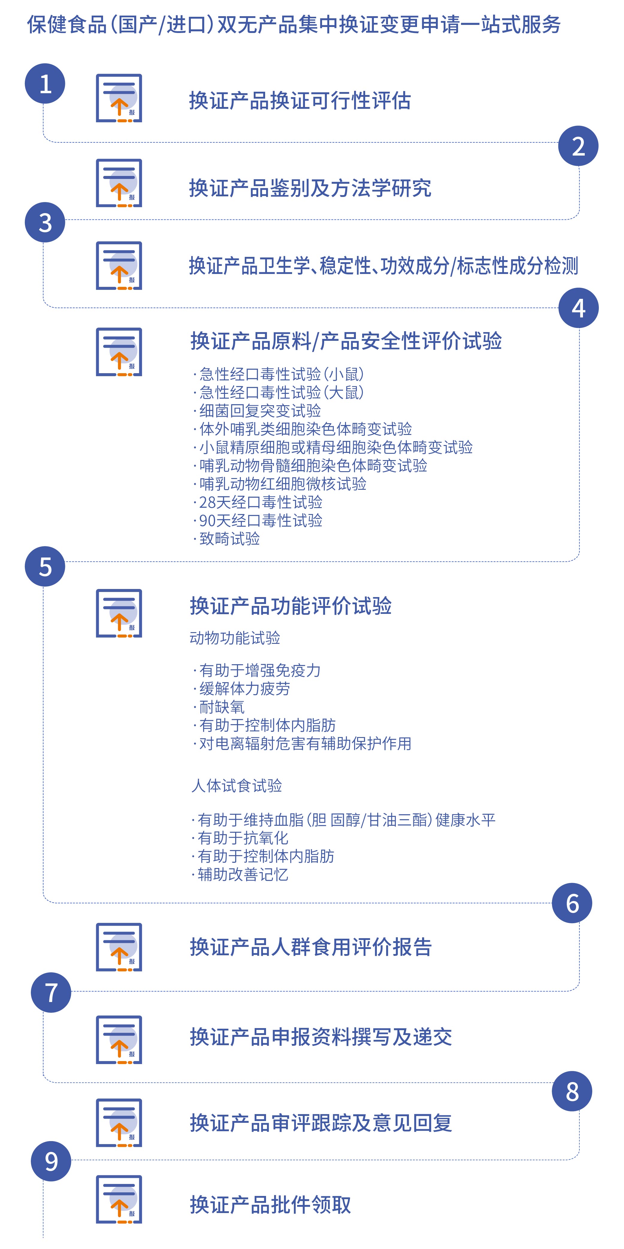 三批次:功效成分/營養(yǎng)成分、衛(wèi)生學(xué)、穩(wěn)定性試驗(yàn) 方法學(xué)驗(yàn)證試驗(yàn) 安全性試驗(yàn) 功能性試驗(yàn) 人體試食試驗(yàn) |